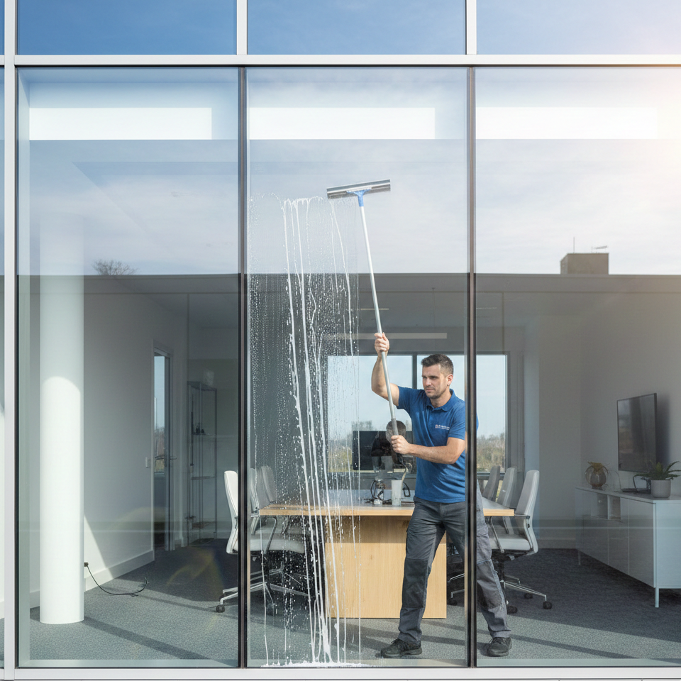 - Reinigung von Glastüren und Trennwänden im Innenbereich.
